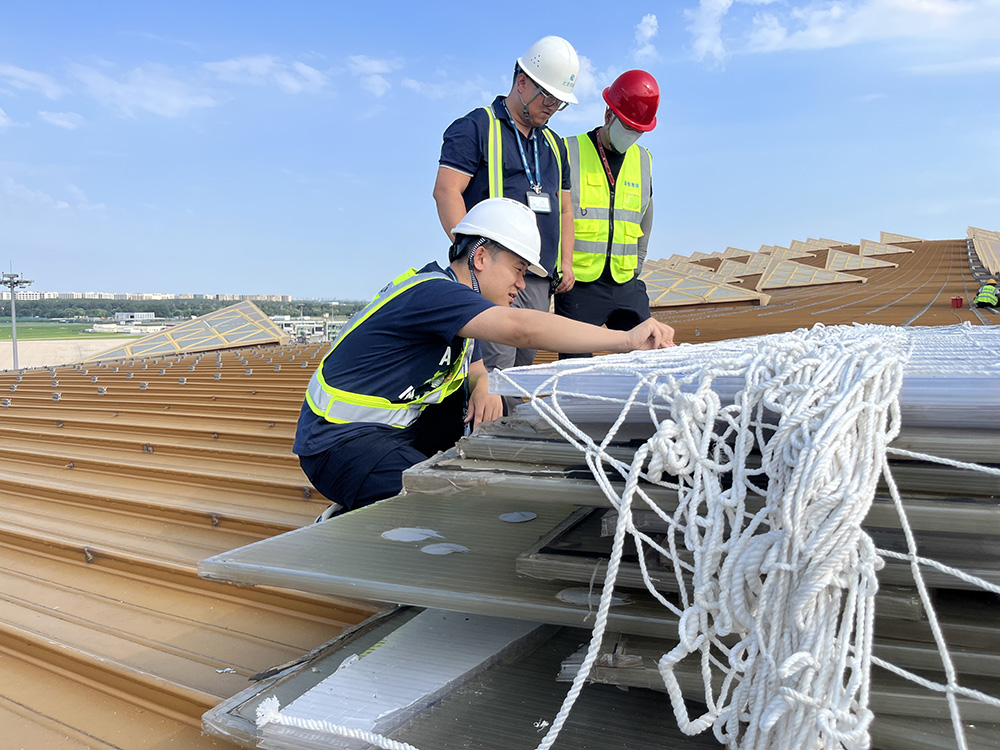 “透過屋頂?shù)牟A?,我能看到樓?nèi)旅客來來往往,享受著空調(diào)的清涼,但他們并不知曉這場屋頂上的‘戰(zhàn)斗’?!表n峰笑著說。而這份“不知情”正是韓峰和項目團隊追求的最高褒獎。在項目團隊的嚴格把控和高效組織下,一塊塊嶄新的高強度采光板精準就位,守護著每一位旅客頭頂上方無風無雨的晴空。