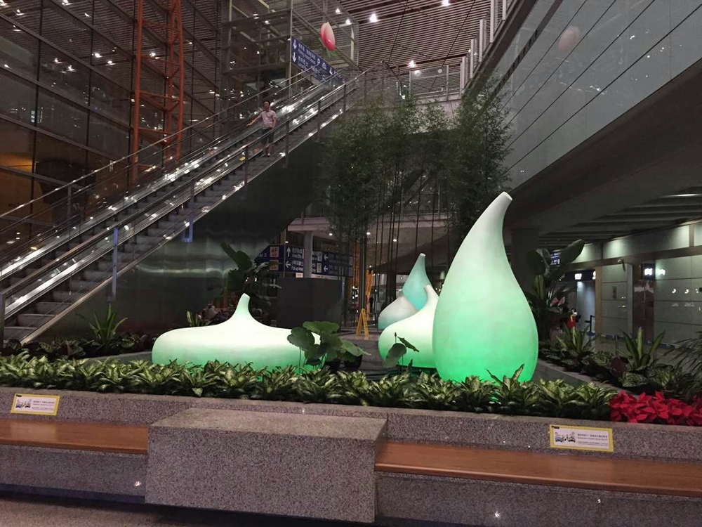 T3C二層進(jìn)港東西兩側(cè)各有一處清新舒適且現(xiàn)代美觀的“小綠洲”景觀。由“水滴”提煉出來(lái)的造型,現(xiàn)代而簡(jiǎn)約,形態(tài)優(yōu)美,象征著清新自然、生生不息的美好寓意。東邊名為《曲苑風(fēng)荷》,以水滴造型設(shè)計(jì)的小品配合流水,通過(guò)燈光和色彩的處理,使小品如同身姿曼妙的舞者,美輪美奐。西邊名為《高山流水》,以秀竹為背景,將小品和流水形象地表現(xiàn)為潺潺流水和巍巍高山相映成趣的意境,仿佛山巒起伏的遠(yuǎn)景就呈現(xiàn)在面前。