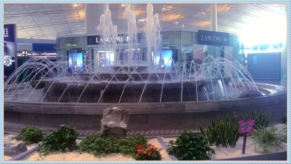 T3E免稅區(qū)的中央景觀設(shè)計了《御泉垂虹》噴泉。它的造型借鑒了萬園之園的圓明園“大水法”,它豐富多彩的噴水形式和色彩把航站樓2公里的軸線裝點得色彩斑斕。在水池的東(青龍)、南(朱雀)、西(白虎)、北(玄武)有四個震水獸,保四方風調(diào)雨順、九洲平安。