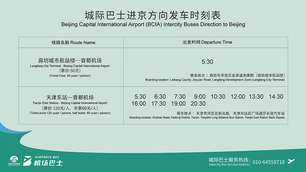 票價(jià):50元(注:持有首都機(jī)場(chǎng)進(jìn)出港航班機(jī)票乘客可免費(fèi)乘坐廊坊城市航站樓機(jī)場(chǎng)巴士。廊坊城市航站樓前往首都機(jī)場(chǎng)的需持有本人3日內(nèi)有效機(jī)票;首都機(jī)場(chǎng)前往廊坊城市航站樓的需持有本人24小時(shí)內(nèi)機(jī)票。)