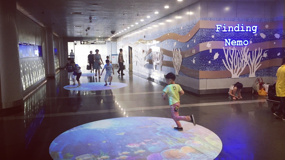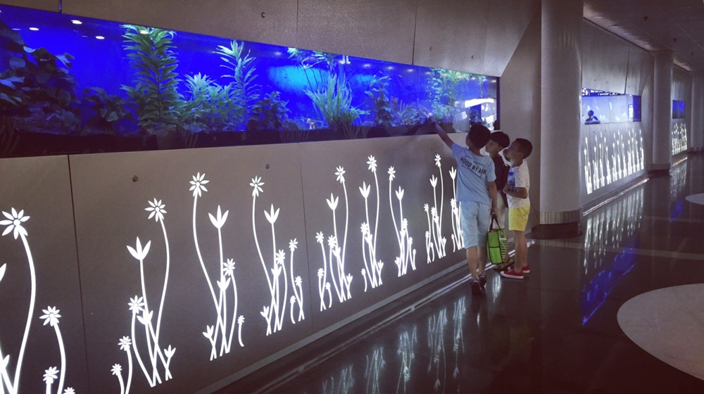 T2連廊口設(shè)置了集“水族觀(guān)賞、合影留念、投影互動(dòng)”于一體的T2“海底世界”景觀(guān)走廊,新加入的投影互動(dòng)系統(tǒng),將T2“海底世界”的動(dòng)態(tài)影像投影于地面,在紅外系統(tǒng)的監(jiān)控下,旅客腳步踩過(guò)“水面”,游魚(yú)會(huì)“匆匆”游走,不經(jīng)意間的高科技互動(dòng)體驗(yàn),為旅客帶來(lái)了意外的歡樂(lè)。