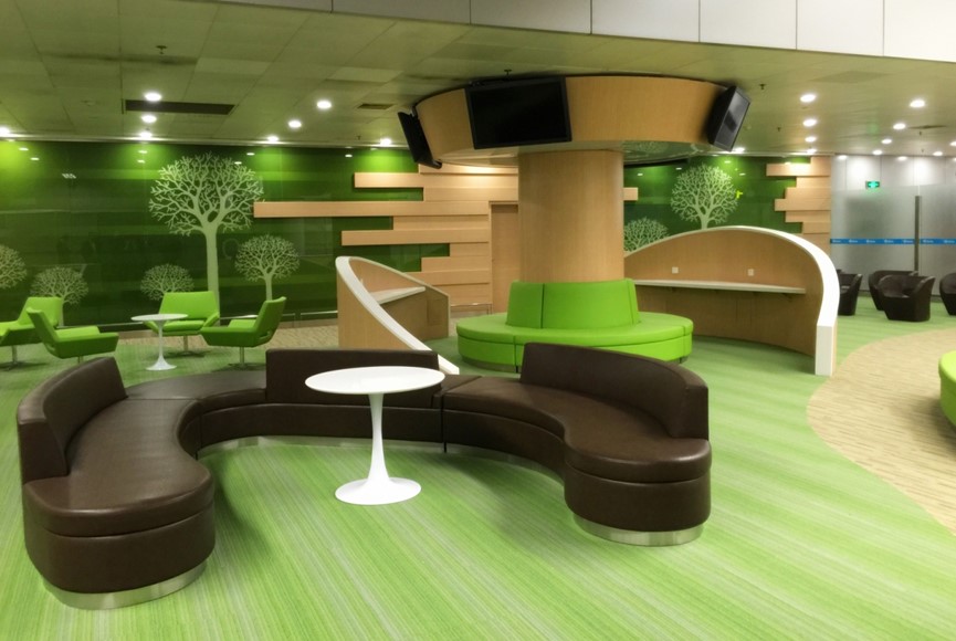 中轉(zhuǎn)休息區(qū)采用清新舒適的綠色為主色調(diào),以“綠洲”為主題賦予了休閑、充電、娛樂等多重功能。舒適的休閑沙發(fā)、便捷的置物桌、貼心的充電設(shè)施、愉悅的電視區(qū)與柔軟的地毯一起,仿佛綠洲的甘泉滋潤(rùn)旅客身心,溫潤(rùn)的淡綠色召喚著疲憊的身體,齊全的設(shè)備驅(qū)散旅行的焦慮,為下一段航程注滿能量。