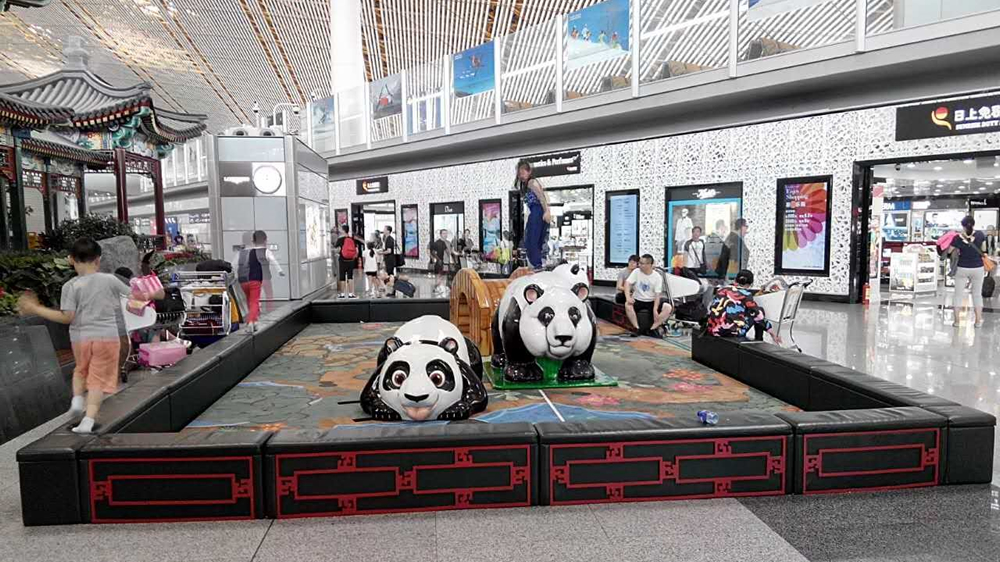 E21登機(jī)口的兒童活動(dòng)區(qū)以中國(guó)國(guó)寶熊貓為主題建造。樂(lè)園內(nèi)憨態(tài)可掬的大熊貓或臥或躺形態(tài)各異,綠色圍墻紅色欄桿與旁邊的中式古建筑相應(yīng)成趣。