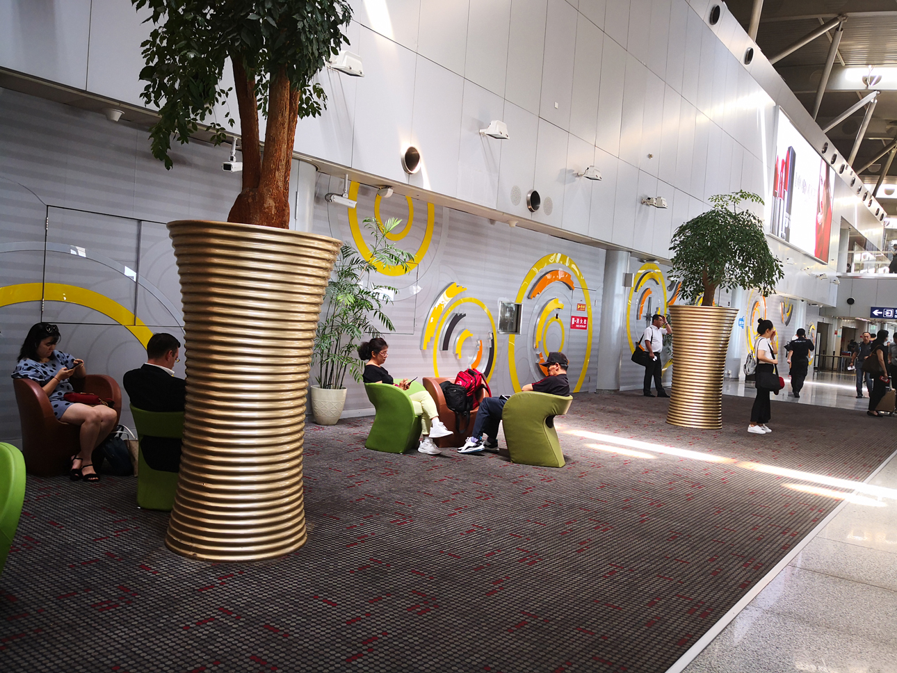 在T2國內(nèi)23號(hào)登機(jī)口設(shè)置了“五光十色”藝術(shù)休閑區(qū)域,供旅客休息。